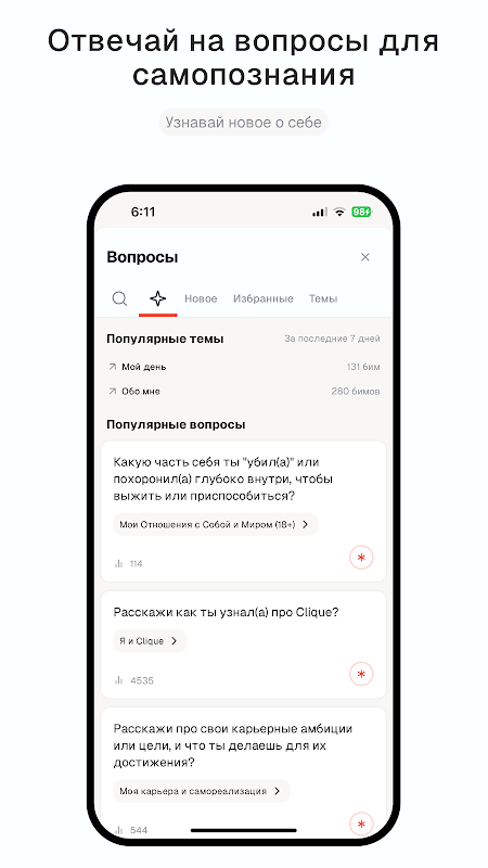 Clique ist ein Chat mit KI, der dir hilft, dich selbst besser zu verstehen, deine Emotionen zu verstehen und deine Ziele zu erreichen. Unsere KI-Assistenten antworten nicht nur – sie stellen die richtigen Fragen, geben ehrliche Ratschläge und unterstützen dich auf deinem Weg zur persönlichen Entwicklung. Clique verbindet dich außerdem mit Gleichgesinnten – Menschen mit ähnlichen Gedanken. Bereits 900.000 Matches in Clique!