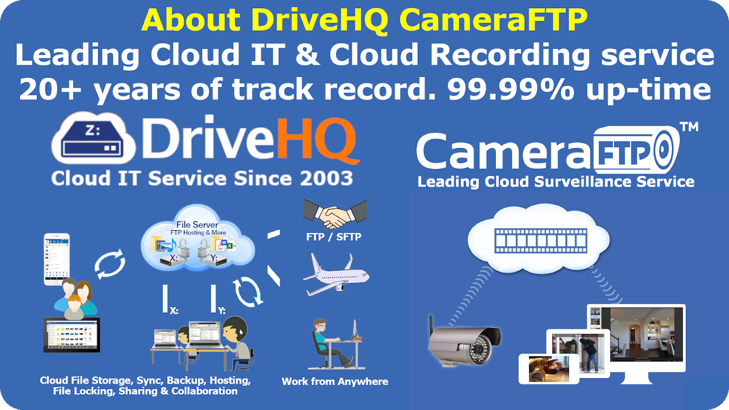 Die CameraFTP-Abteilung von DriveHQ ist ein führender Cloud-Recording-Dienstleister (Heim-/Geschäftsüberwachung), der FTP-Cloud-Speicher für IP-Kameras und NVRs anbietet. DriveHQ blickt auf eine über 20-jährige Erfolgsgeschichte zurück. Bitte melden Sie sich jetzt für eine kostenlose Testversion an.