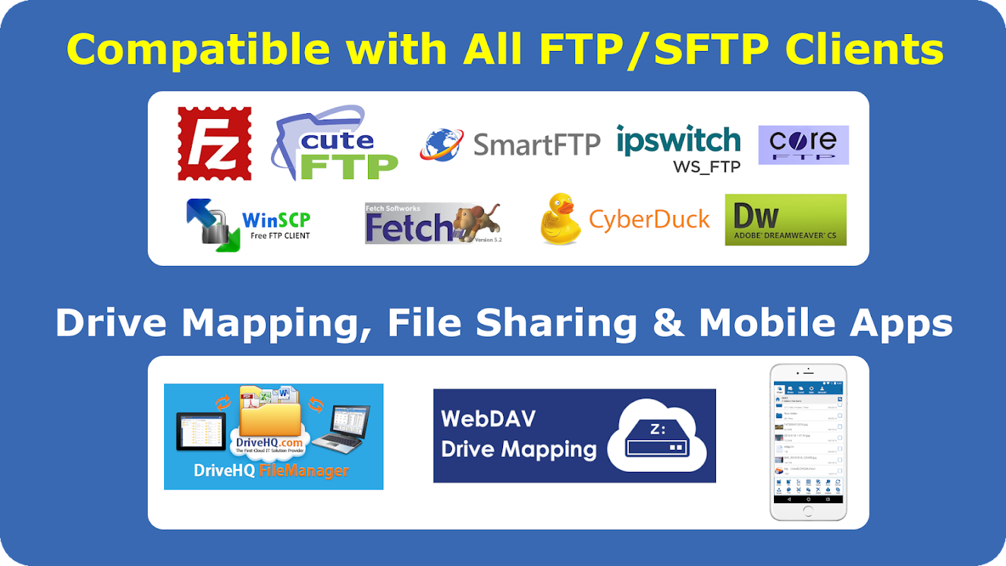 Der DriveHQ Cloud FTP-Server ist sehr schnell mit praktisch unbegrenzter Bandbreite und mit einer Verfügbarkeit von über 99, 99% äußerst zuverlässig. Es unterstützt sicheres FTP mit FTP über SSL/TLS (FTPS/FTPES) und SFTP.
