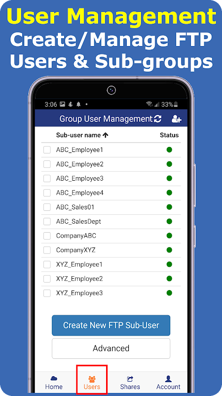 Mit dem DriveHQ Cloud FTP Server können Sie Unterbenutzer erstellen. Sie können reguläre FTP-Konten für Ihre Mitarbeiter (Kollegen) und Gastkonten für externe Kunden erstellen. Jeder Benutzer verfügt über seine eigenen Anmeldeinformationen und seinen eigenen FTP-Stammordner. Sie können verschiedene Ordner für verschiedene Unterbenutzer mit schreibgeschützten oder Lese-/Schreibberechtigungen freigeben. Dies ist die beliebteste Methode zum sicheren Teilen großer Dateien mit mehreren Clients.