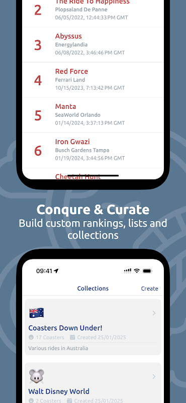 Mit zunehmender Anzahl protokollierter Fahrten erhältst du Auszeichnungen und kannst deine persönlichen Highlights verfolgen – von den schnellsten und höchsten Achterbahnen bis hin zu den Achterbahnen mit den meisten Inversionen. Du kannst deine Achterbahn-Abenteuer auch nach Park oder Saison sortieren und personalisierte Listen erstellen. Zu den Erfolgen, die du erreichen kannst, gehören: