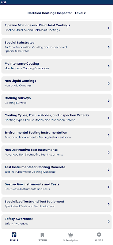 Die App „Coating Inspector“ wurde von zertifizierten Beschichtungsinspektoren entwickelt, die einen systematischen Selbstlernansatz erfolgreich umgesetzt haben. Die App ist Ihr ultimativer Begleiter, um die notwendigen Kenntnisse und Fähigkeiten zu erlernen, die für die Zertifizierung von Beschichtungsinspektionen erforderlich sind, wie z. B. NACE/AMPP oder BGAS-CSWIP Level 1, Level 2 oder Level 3. Mit Funktionen wie Fortschrittsverfolgung, einer Liste mit bevorzugten Fragen und realistischer Prüfungspraxis können sich Benutzer auf Bereiche konzentrieren, die verbessert werden müssen, und ihr Verständnis wichtiger Konzepte vertiefen, um sicherzustellen, dass sie gut auf ihre Zertifizierung vorbereitet sind.