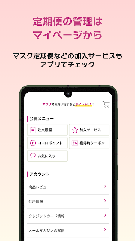 Wenn Sie bereits Mitglied von COCORO STORE sind, können Sie durch die Anmeldung und Nutzung der App ganz einfach die regelmäßige Lieferung von Masken und andere abonnierte Dienste verwalten und einrichten und Ihre Punktesammelrate erhöhen.