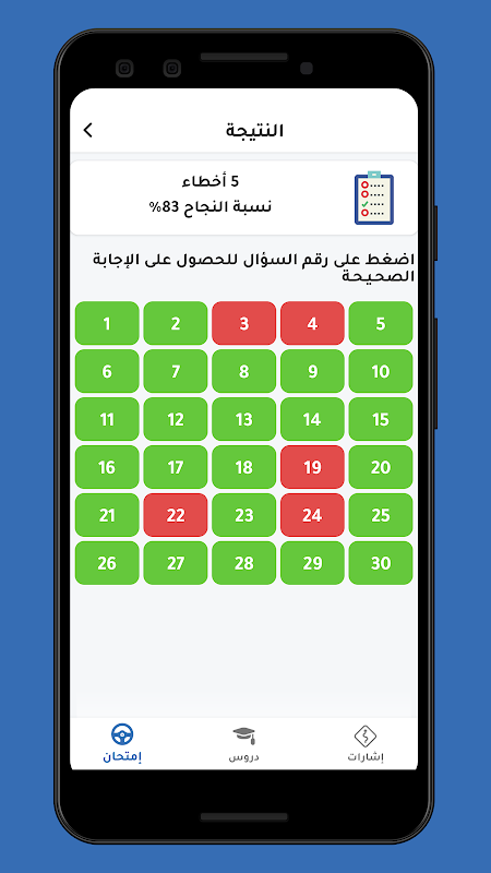 Eine Anwendung, die ähnliche Fragen wie der offizielle Test enthält und sich auf folgende Themen konzentriert: Verkehrszeichen und -schilder, Fahrer und Wagen, Parken und Anhalten, Boykott und Überholen, Priorität des Verkehrs, Golan-Regeln, Golan-Verbrechen, Erste Hilfe, vorbeugende Wartung und Energiekontrolle, Transport gefährlicher Materialien über Straßen