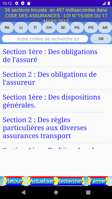 Das eingegebene Kriterium ist in den verschiedenen Ebenen (Buch (LI), Teil (PA), Titel (TI), Kapitel (CH), Abschnitt (SE), Absatz (PG), Punkt (PO), Artikel (AR) leicht zu finden. und Inhalt (OK)) der Veröffentlichung.