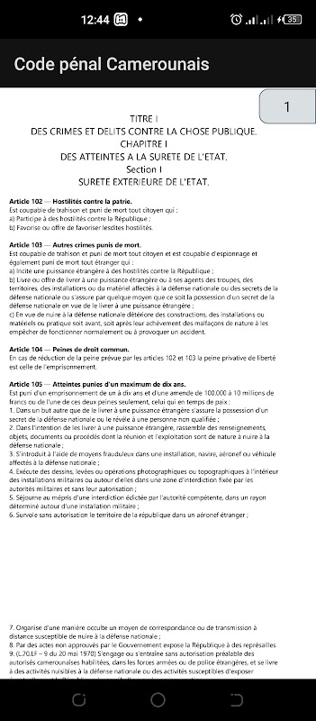 Diese Anwendung bietet Auszüge aus dem Strafgesetzbuch, deren Rechte und Inhalt den jeweiligen Autoren, insbesondere den zuständigen kamerunischen Regierungsbehörden, gehören. Die bereitgestellten Informationen dienen ausschließlich Bildungs- und Informationszwecken. Wir stehen in keiner Verbindung zu öffentlichen Behörden und die Darstellung dieser Inhalte stellt keine offizielle Auslegung oder rechtliche Billigung dar.