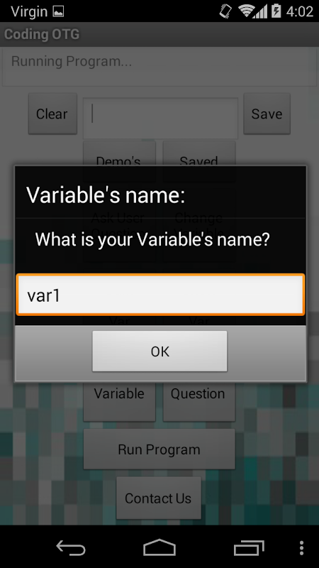CodingOTG's design has been created with ease of use in mind. This is the case as CodingOTG uses a series of buttons with some text boxes to create its programs. CodingOTG uses a completely new coding language with some similarity's to C and Java.