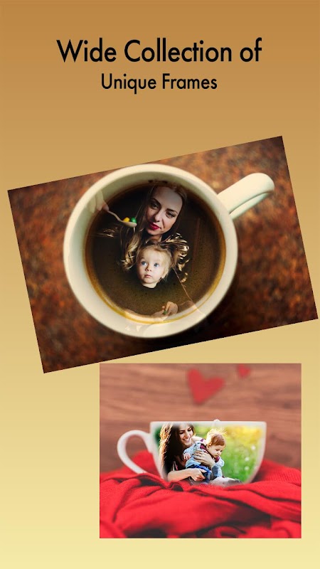 With this coffee cup app, you can edit pictures from gallery or camera pictures, choose the coffee mug photo frame of your choice, add text, save in high definition (HD) quality and share with your loved ones.