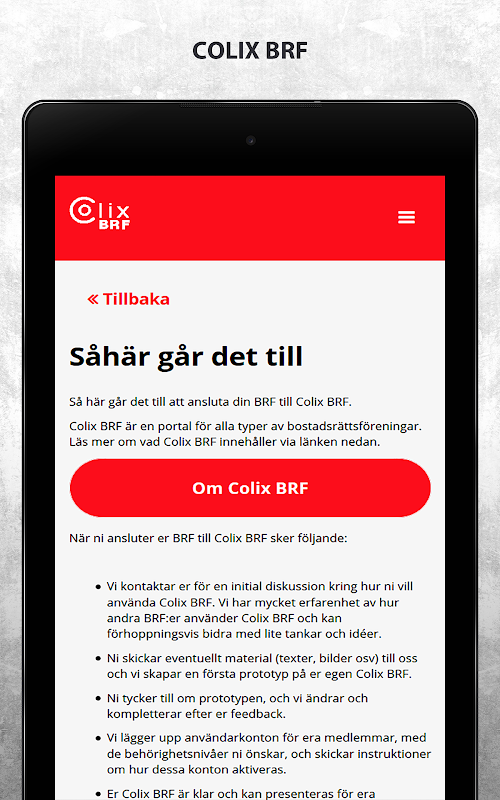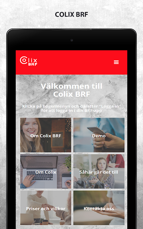 Colix BRF är en portal för administration av bostadsrättsföreningar. Via Colix BRF loggar du in till din bostadsrättsförenings app. Colix BRF har en bred funktionalitet för administration av bostadsrättsföreningar. Här kan man bland annat tillhandahålla information av olika slag, boka gemensamma resurser så som tvättstuga och festlokal, ha en öppen digital anslagstavla, skriva styrelseprotokoll och andra dokument samt lägga upp användarkonton och användargrupper för att tillgängliggöra olika typer av information för olika grupper, exempelvis styrelsen.