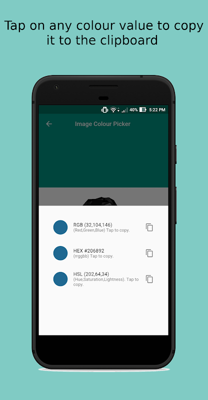 Color Picker Werkzeug für Fotos. Laden Sie ein Foto auf Ihrem Telefon, tippen Sie irgendwo auf das Bild und erhalten die RBG, Hexadezimal oder HSL-Farbcodes von diesem Punkt. Tippen Sie auf den Code und es wird in die Zwischenablage kopiert. Nützlich für Web-Entwicklung, Bildbearbeitung oder einfach nur, wenn Sie die Farbe eines Teils eines Fotos finden mögen.