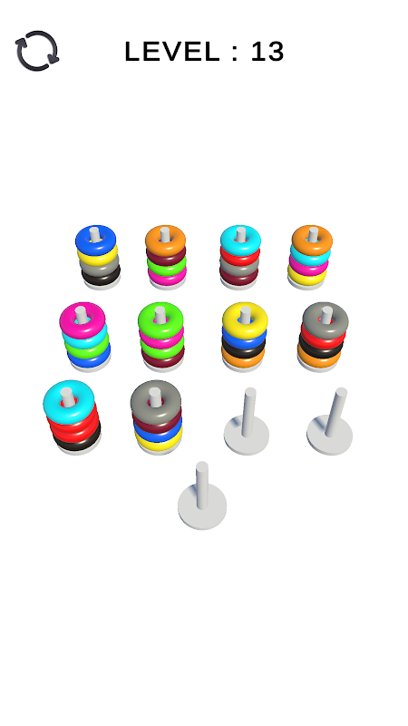 Verschiedene Farben befinden sich zufällig in verschiedenen Spalten. Ziel ist es, gleichfarbige Ringe in derselben Spalte zu sammeln. Dazu musst du die Ringe tragen und die richtigen Züge machen. Jede Farbe muss in derselben Spalte liegen. Schaffst du das?