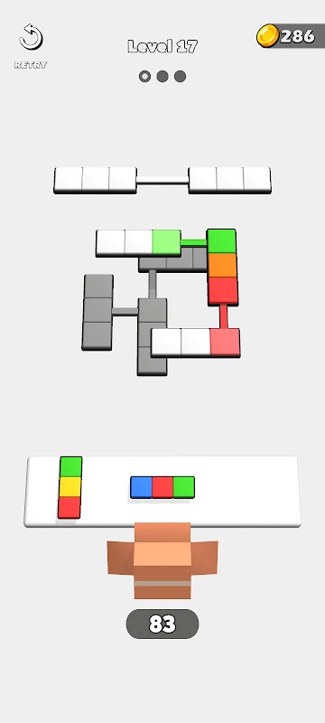 Für jedes Plättchen muss eine bestimmte Kombination farbiger Blöcke zerstört werden. Verbinde die Blöcke und respektiere dabei die Verbindungen zwischen den Kacheln, um jedes Rätsel präzise zu lösen. Es gibt verschiedene Arten von Blöcken: Zeilenblöcke und Spaltenblöcke, die den Schwierigkeitsgrad erhöhen. Wenn Sie nicht den richtigen Farbblock haben, ziehen Sie vom Stapel, um mehr farbige Teile zu erhalten.