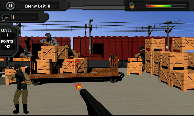 Combat War is a new kind of game in which there are some moving targets which are coming towards you, your objective is to clear them all and enter to the next war arena. In Combat war you have been allocated with a gun with which you have to shoot and earn points to unlock other guns with better specifications.