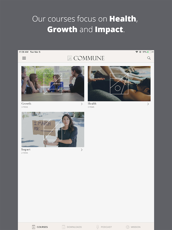 Mit der Commune-App können Sie jetzt Kurse offline ansehen und anhören, Wiedergabelisten Ihrer Lieblingsvideos erstellen und über Chromecast, Airplay oder Bluetooth Screencasts erstellen.