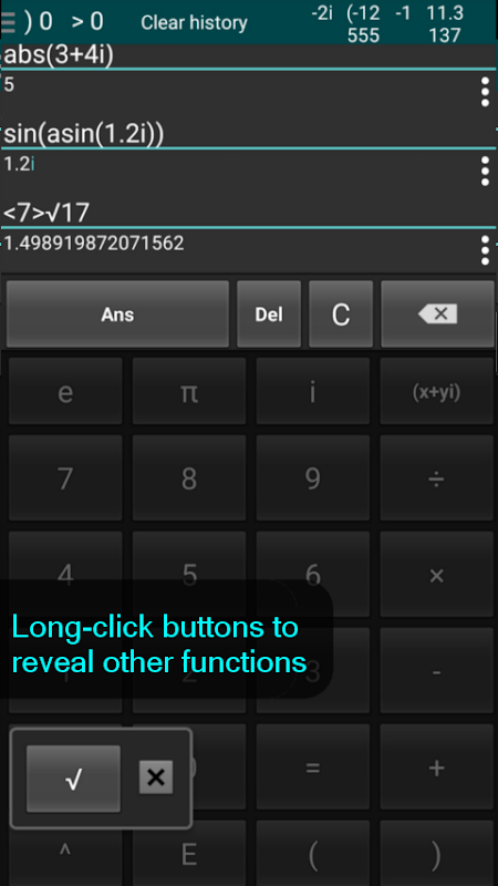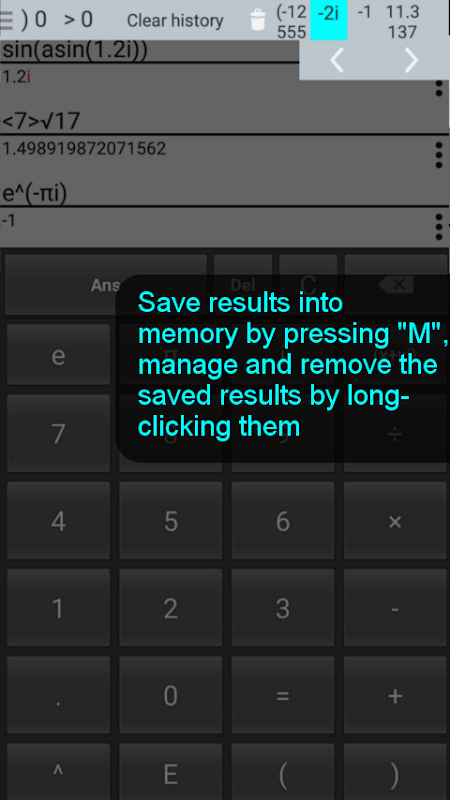 Complex Scientific Calculator (oder einfach Complex Calc) ist das Schweizer Messer eines echten Mathematikers. Dieses Hochleistungswerkzeug bietet alle Funktionen eines wissenschaftlichen Rechners und ist einzigartig für die Fähigkeit, mit komplexen Zahlen zu arbeiten. Es implementiert auch die notwendigen Funktionen zum Arbeiten auf der komplexen Ebene, z. Argument und Konjugation.