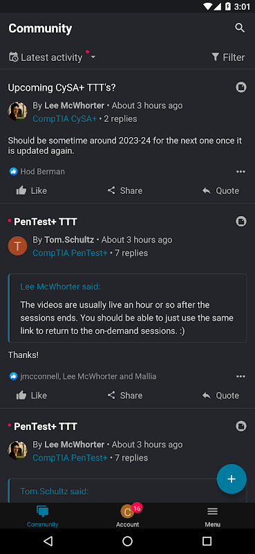 Willkommen in der Community des CompTIA Instructors Network! Alles, was Sie an der Interaktion mit unserer Community geliebt haben, jetzt in einem mobilen Erlebnis. Genießen Sie schnellen Zugriff auf die neuesten Aktivitäten, Unterstützung für benutzerdefinierte Gesten und legen Sie Einstellungen dafür fest, worüber Sie Benachrichtigungen erhalten.