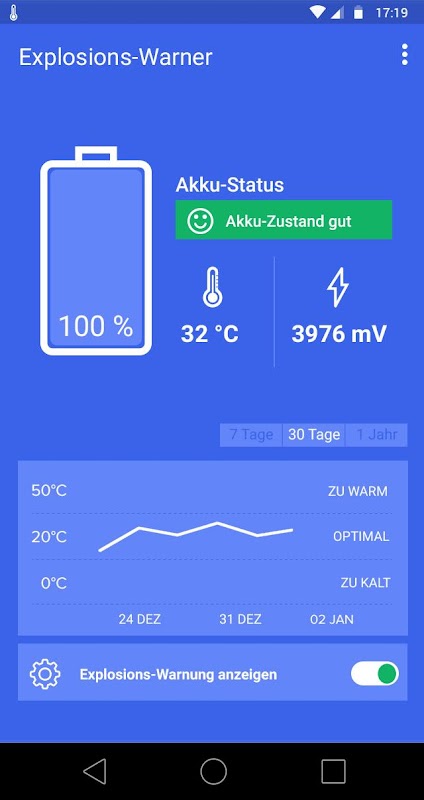 Die Zuverlässigkeit und Sicherheit Ihres Smartphone-Akkus hängt unter anderem von der aktuellen Betriebs-Temperatur ab. Mit dem COMPUTER BILD Explosions-Warner haben Sie die aktuelle Temperaturzustand des Smartphone-Akkus stets im Blick.