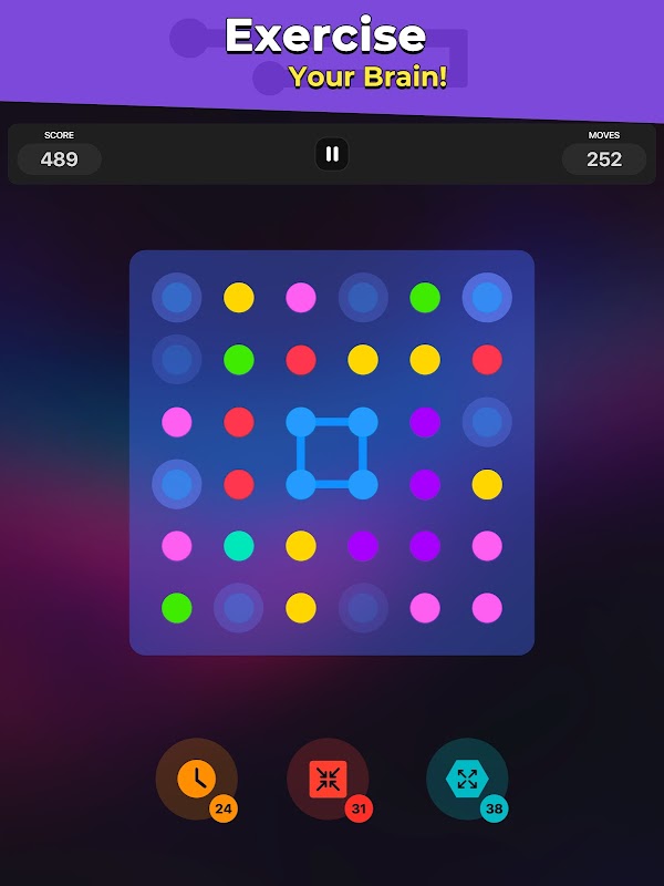 Dots hat drei Modi, um jeden Spielertyp zufrieden zu stellen. Rennen Sie im Zeitmodus gegen die Uhr, denken Sie strategisch im Moves-Modus oder lehnen Sie sich zurück und entspannen Sie sich im Endlos-Modus. Sammle Punkte auf dem Weg, um Power-Ups zu erhalten.