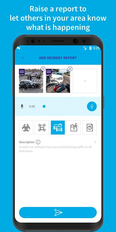 - Melden und teilen Sie Vorfälle wie Raubüberfälle, Autounfälle und verlorene Gegenstände.