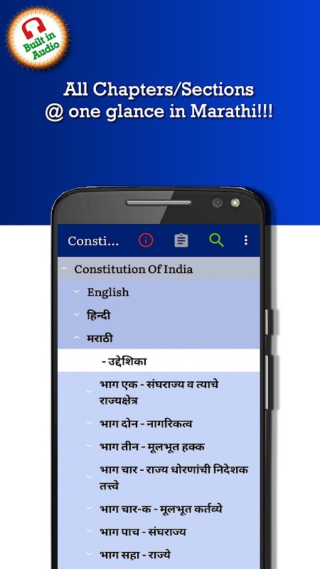 ✓ Es handelt sich um eine polyglotte App, d. h. die gesamte Verfassung Indiens ist derzeit auf Englisch, Hindi und Marathi verfügbar.