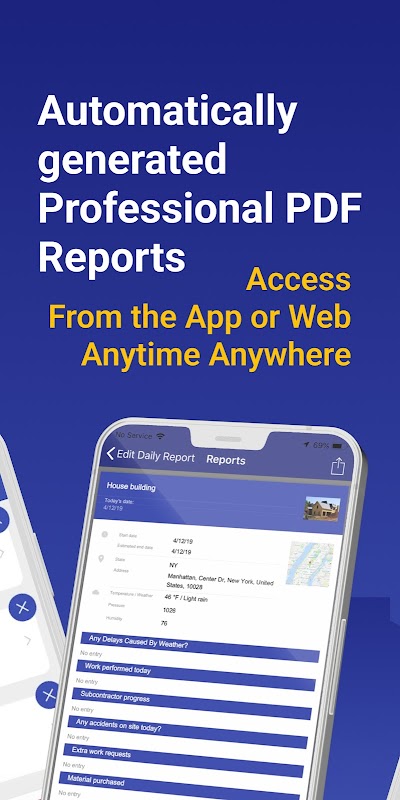 Die App enthält Details zum Auftragnehmer, Standortinformationen, durchgeführte Arbeiten, Fortschritt des Subunternehmers, Probleme und Mängellisten, Gründe für Verzögerungen, zusätzliche Arbeiten oder Änderungswünsche, gekaufte und erhaltene Materialien, Arbeits- und Reisezeiten und mehr. Die App erfasst Wetterbedingungen, Standorte, Datum und Uhrzeit, geleistete Arbeit und andere feldbezogene Informationen jederzeit und überall.