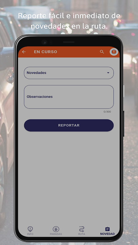 Mit unserer App können Sie den Plan und die Routenkarte Ihrer Fahrten kennen, Standorte melden, Haltestellen benachrichtigen und Neuigkeiten über die Paniktaste registrieren, Sie können den GPS-Standort des Mobilgeräts melden und auch fotografische Aufnahmen davon machen Ihre Liefernachweise .