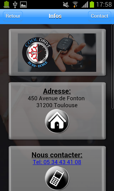 L'application "Cool Drive" vous offre la possibilité de consulter toutes les infos utiles de l'auto-école (Tarifs, prestations, avis…) mais aussi de recevoir leurs dernières News ou Flyers sous forme de notifications Push.