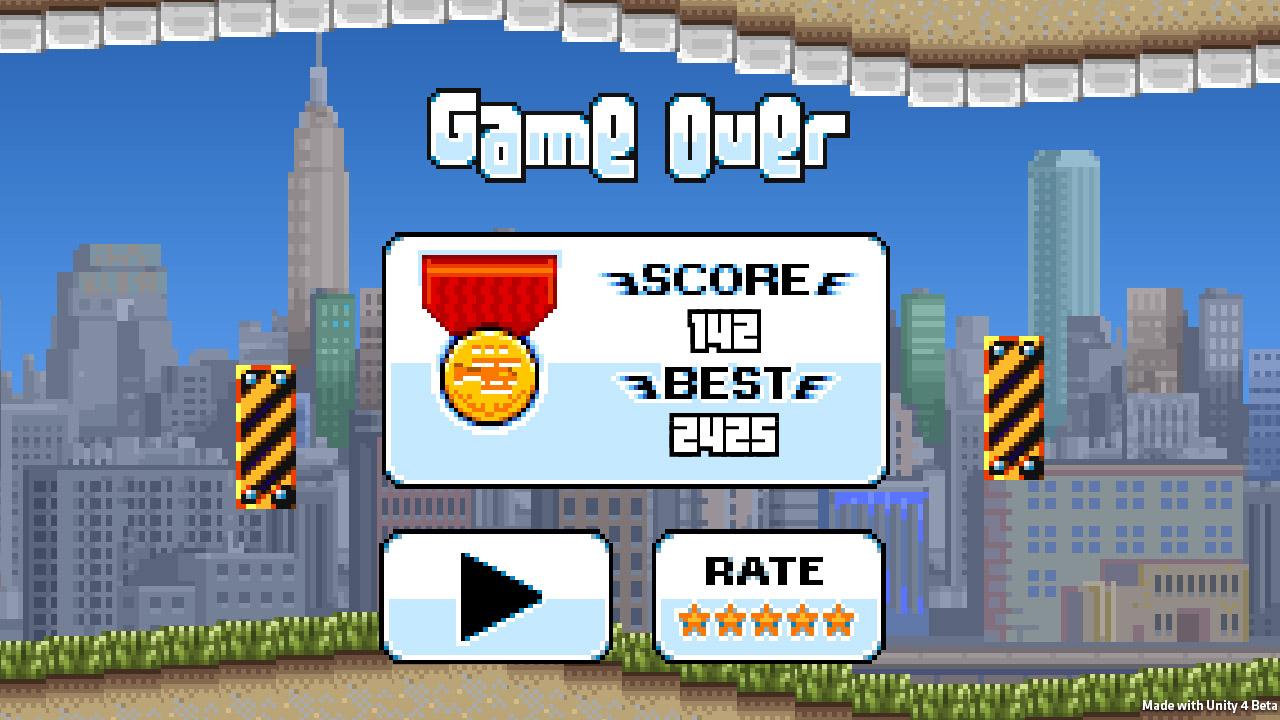 The gameplay is very simple: you must fly as far as you can. Press and hold your finger on the screen to fly up, release finger to go down. You should avoid the helicopter touching the hurdles and the walls from top and bottom.