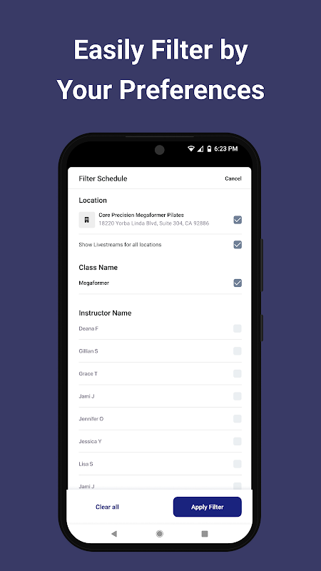 Auf der Suche nach Vormittags- oder Abendkursen? Filtern Sie unseren Studioplan nach Vorlieben wie Kursart und Dozent, um genau die Erlebnisse zu finden, die Sie bei Core Precision buchen möchten.