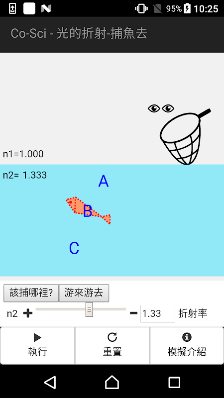 "該捕哪裡?": 此情境假設人在水面上(n1=1.0)看到水裡(n2=1.333)有隻魚(淡橘色虛像),請問他該將魚網放在哪裡(A,B,C)可以捉到水裡的魚呢?請將魚網以滑鼠拖曳到你認為補得到魚的地方(A,B或C)後放開,如果魚網位置正確,則模擬會自動顯示魚的實像(深橘色)與光的路徑。如果改變n2值時眼睛所看見的魚的虛像位置會如何變化呢?