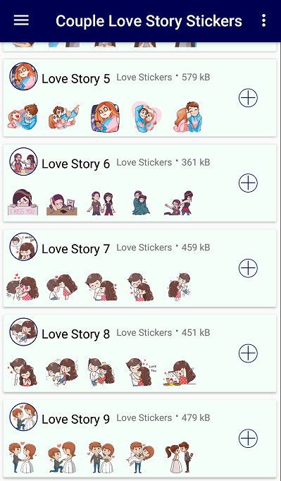 You can use couple love story stickers in WhatsApp chats. The most attractive and cool stickers have been selected for you in our mobile application. You can express your feelings more easily with these stickers. These stickers will be very useful when you get angry or you don't want to tell your loved ones. You must have the latest version of whatsapp installed on your mobile phone.