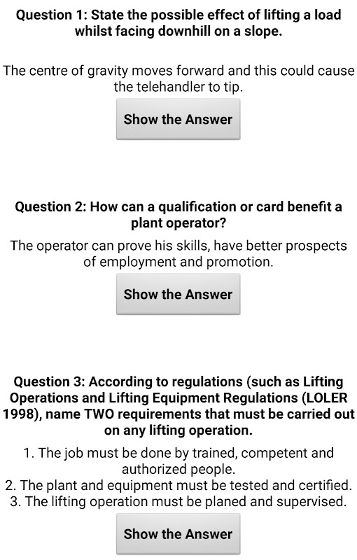 App enthält alle 72 Antworten für die mündliche theoretische Prüfung zum CPCS A17 Teleskoplader