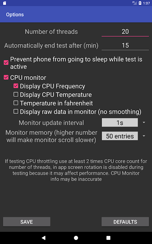App lädt CPU mit bis zu 100 Threads und misst die Performance. Wenn Telefon CPU-Kühlung verarbeiten kann (die meisten nicht) Leistung bleibt konstant, aber wenn es nicht CPU zu drosseln startet und die Geschwindigkeit verringern.