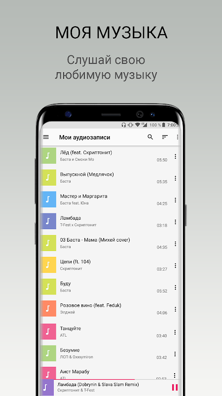 - Динамически измеряемый список воспроизведения. Выбирай дорожку в любом списке, и он автоматически станет текущим.
