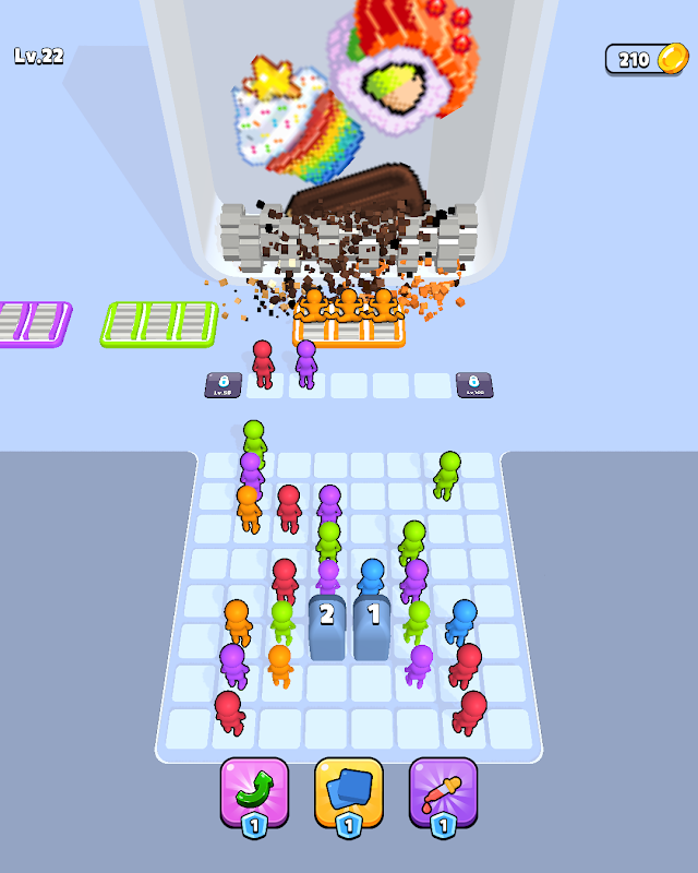 Schicken Sie die Strichmännchen entsprechend ihrer Farbe auf die Bänder und zerquetschen Sie die Objekte!