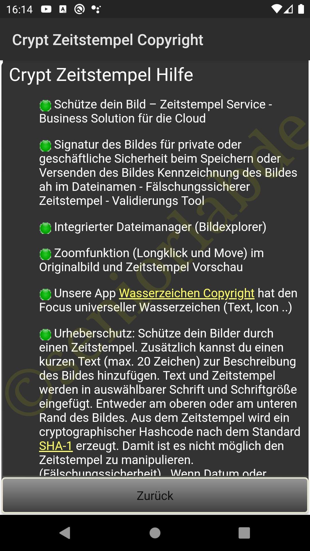 Urheberschutz: Schütze dein Bilder durch einen Zeitstempel. Zusätzlich kannst du einen kurzen Text (max. 20 Zeichen) zur Beschreibung des Bildes hinzufügen. Text und Zeitstempel werden in auswählbarer Schrift und Schriftgröße eingefügt. Entweder am oberen oder am unteren Rand des Bildes. Aus dem Zeitstempel wird ein kryptographischer Hashkode nach dem Standard SHA-1 erzeugt. Damit ist es nicht möglich den Zeitstempel zu manipulieren. (Fälschungssicherheit) . Wenn Datum oder Uhrzeit manipuliert werden, stimmt der Hashwert nicht mehr, was man mit der Validierungsfunktion “Berechne Hashwert” überprüfen kann. Der Kontrast des eingefügten Textes, des Zeitstempels und des Hashcodes kann verändert werden (Wasserzeichen). Die Farbe für Text und Zeitstempel und für der Hashwert können getrennt gewählt werden.