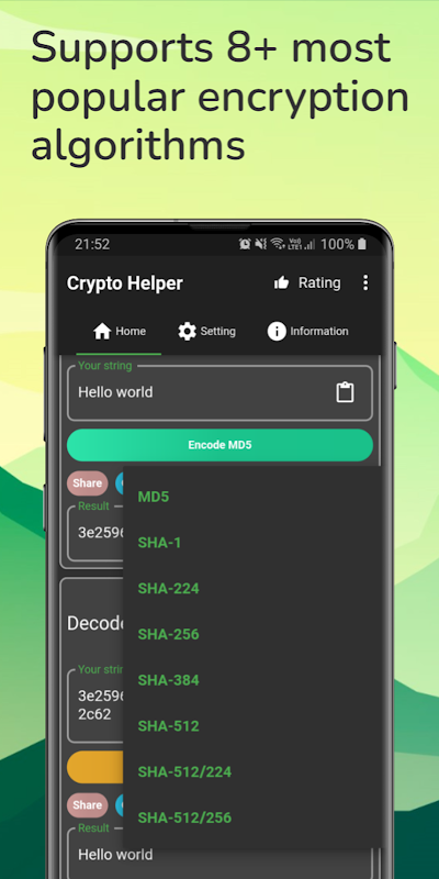 Crypto Helper – Hash MD5 SHA ist ein Tool, das das Kodieren und Dekodieren Ihrer Zeichenfolge unterstützt