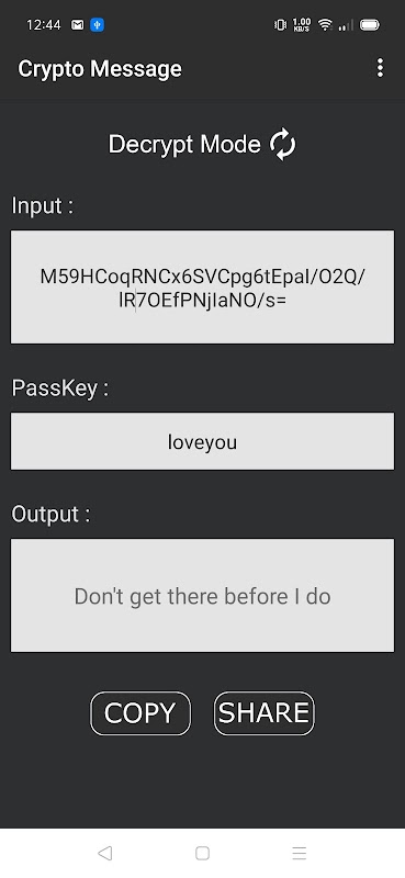 Crypto Message is an app that will let you encrypt your message with passkey thus make your secret message. Only people who have the passkey that you set, can decrypt it. It`s simple but useful at some moments of your life!