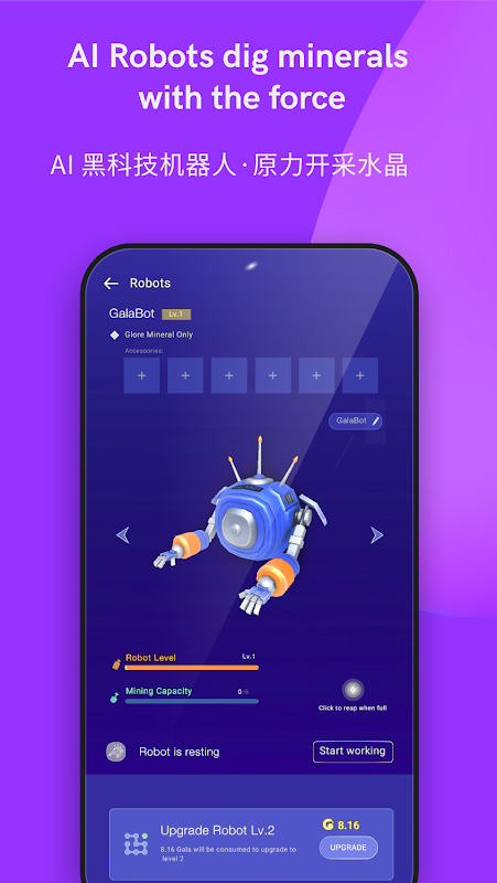 - Kaufe und verbessere deine GalaBot-Bagger, um deine Bergbaukapazität zu erweitern