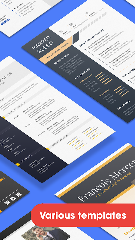 Mit dieser Lebenslauf-App können Sie Ihr Foto auswählen und es Ihrem Lebenslauf hinzufügen. Es bietet einfache Vorlagen zum Ausfüllen, und wenn Sie mit dem Layout nicht zufrieden sind, können Sie es ändern, um es besser an Ihre Bedürfnisse als Arbeitssuchender anzupassen. Indem Sie sich für eine Lebenslaufvorlage entscheiden, können Sie die Dinge einfach halten und gleichzeitig sicherstellen, dass Sie alle notwendigen Details für die Bewerbung ausgefüllt haben. CV Resume Builder ist die beste Lösung für Karriere-Builder.