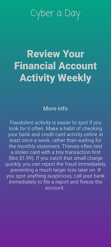 Cyber a Day ist eine einfache, aber leistungsstarke App, die Ihre digitale Sicherheit verbessert – Tag für Tag. Jeden Morgen erhalten Sie einen praktischen und leicht verständlichen Tipp, der Ihnen hilft, Ihre Privatsphäre, Ihre persönlichen Daten und Ihre Geräte vor Online-Bedrohungen zu schützen.