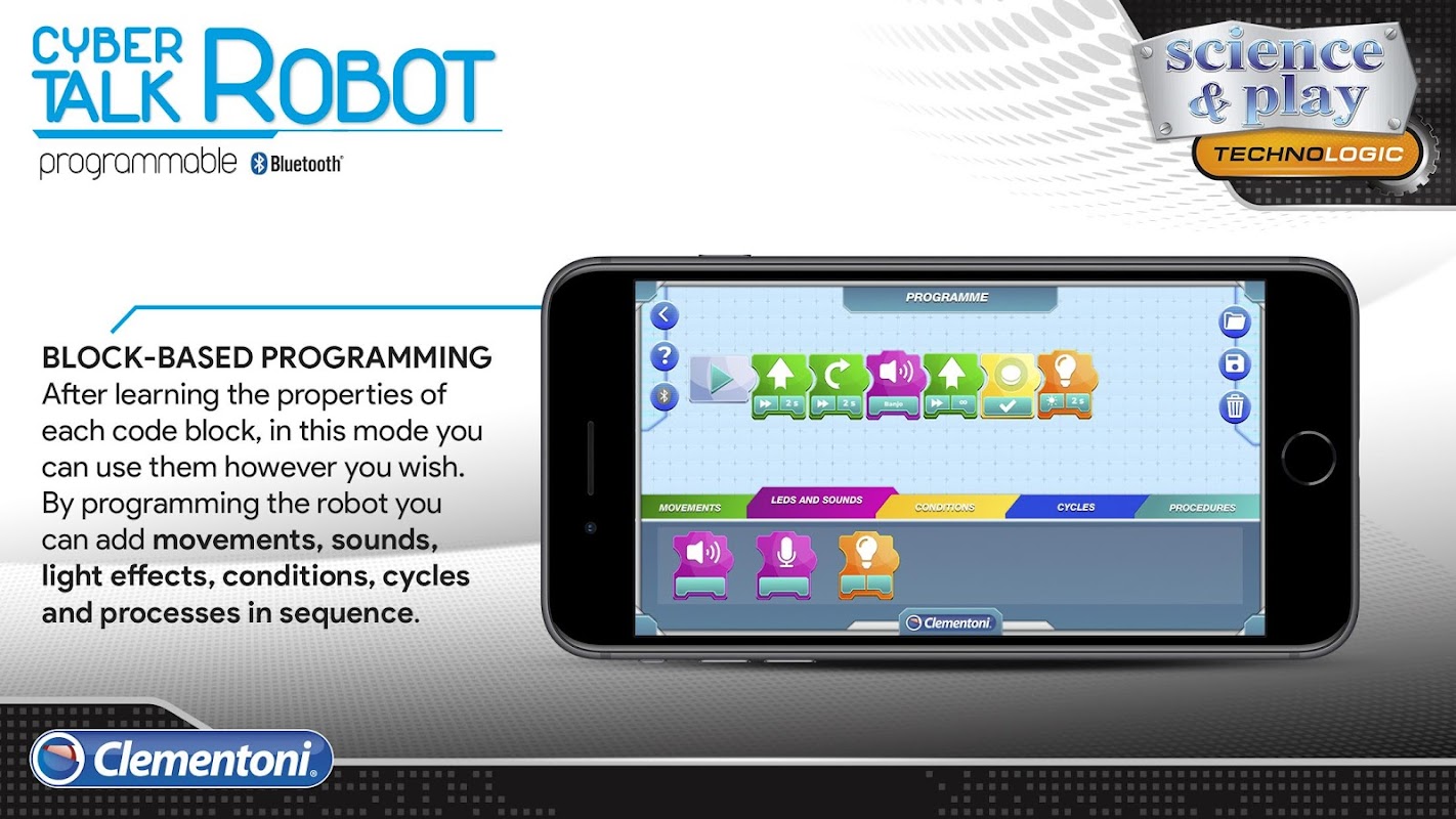 Cyber Talk ist die perfekte Vereinigung von Spaß und lehrreichem Inhalt. Mit diesem Roboter und seinen Aktivitäten kannst du die Prinzipien der Programmierung lernen. Dies ist ein sehr wichtiges Fach, das den Geist anregt und zum Lösen von Aufgaben und Problemen dient. Außerdem kannst du Sprachnachrichten aufzeichnen, verzerren und senden und damit viel Spaß haben.