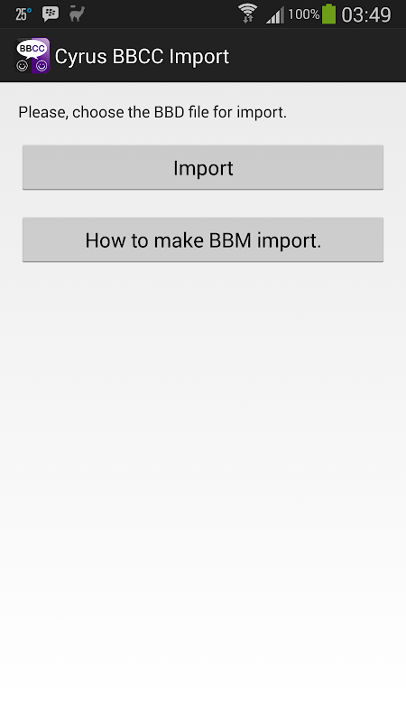 Cyrus Blackberry contacts, history log, and memo transfer. This application will import blackberry contacts, history log, and memo from blackberry to android. You will need Cyrus BBCC Export apps on blackberry to start the transfer/export data and import it using this application.