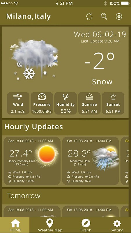 ☀️ This daily weather app weather tracker display current temperature, daily and hourly forecasts, sunrise and sunset time, humidity, wind speed and air pressure with weather today & weather tomorrow.