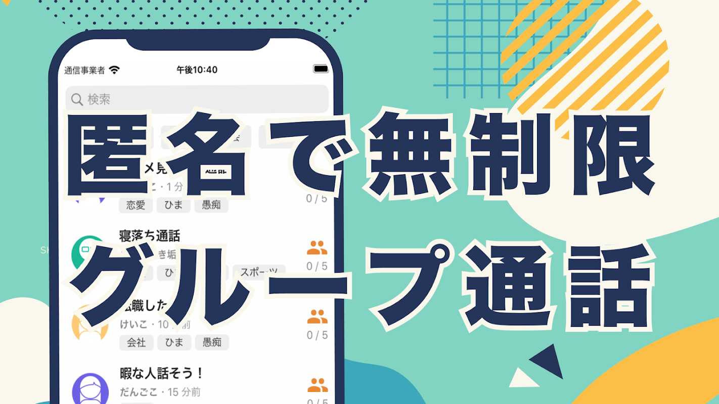 【完全無料】グループ電話、電話アプリ、匿名電話、悩み相談、おしゃべり、作業用通話には最適なグループトークアプリ。登録不要で見知らぬ人と話せる無料通話アプリです。