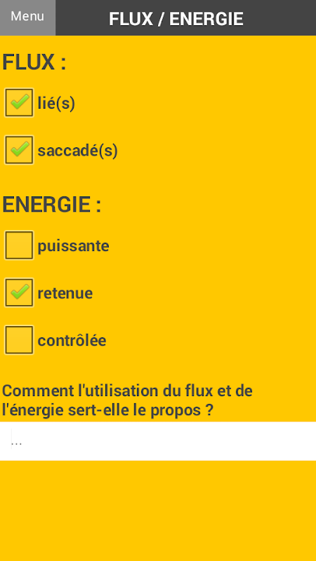 Die Arbeits Logik ist folgende: der Student Betrachter beobachtet einen Parameter einer Choreografie auf dem Ziel des Unterrichts basiert. Die Anwendung ist in sechs Beobachtungs Themen aufgeteilt: Raum, Zeit, Fluss / Energie, Zusammensetzung Verfahren, Interpretation der Tänzer und die emotionalen Wirkung.