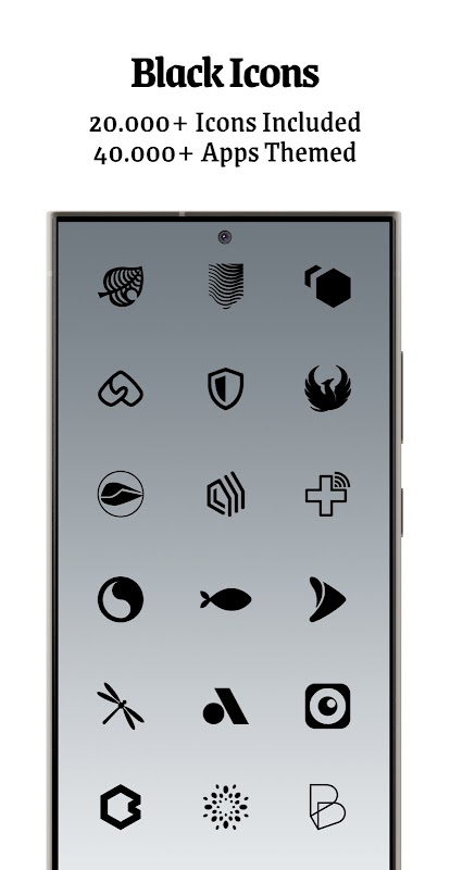 Erleben Sie die dunkle Seite Ihres Android mit einer monochromen Sammlung schwarzer Symbole. Das formlose Design verleiht Ihrer Einrichtung eine minimalistische Note und ergibt eine tolle Kombination mit den mitgelieferten hellen Tapeten!