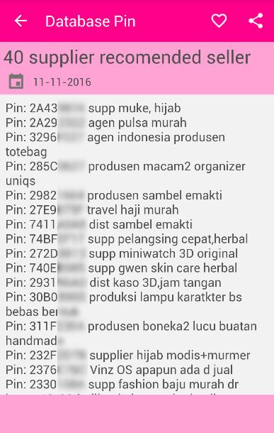 Didalam aplikasi sederhana ini terdapat ratusan pin bb supplier dari berbagai macam barang. Ada penjual baju, kosmetik, mainan, hijab, dan masih banyak lainnya. Seperti yang ramai diperdagangkan, disini saya share gratis agar meminimalisir hal tersebut.