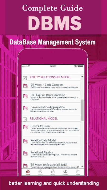 Die App ist eine kostenlose Tutorial von Advance-Datenbank-Management-System - DBMS, die wichtigen Themen, Notizen, Materialien und Neuigkeiten auf dem Kurs behandelt. Laden Sie die App als Referenzmaterial und digitales Buch für Informatik, Software-Engineering-Programme und IT-Studiengänge.