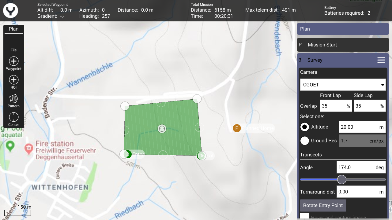 1. Mission Planning (Waypoint / Survey) - Auto-generieren Flugrouten und Kamerasteuerung basierend auf benutzerdefinierten Parametern